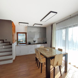 Domek wykończony w wysokim standardzie, estetycznie, bardzo czysto. Przystosowany do wygodnego i komfortowego noclegu dla 10 osób, dla rodzin jak i grup znajomych.